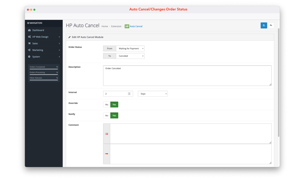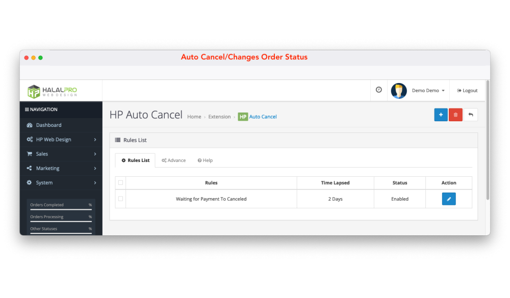 - Add order status change rule from one order status into another within certain Hours or Days Interval.