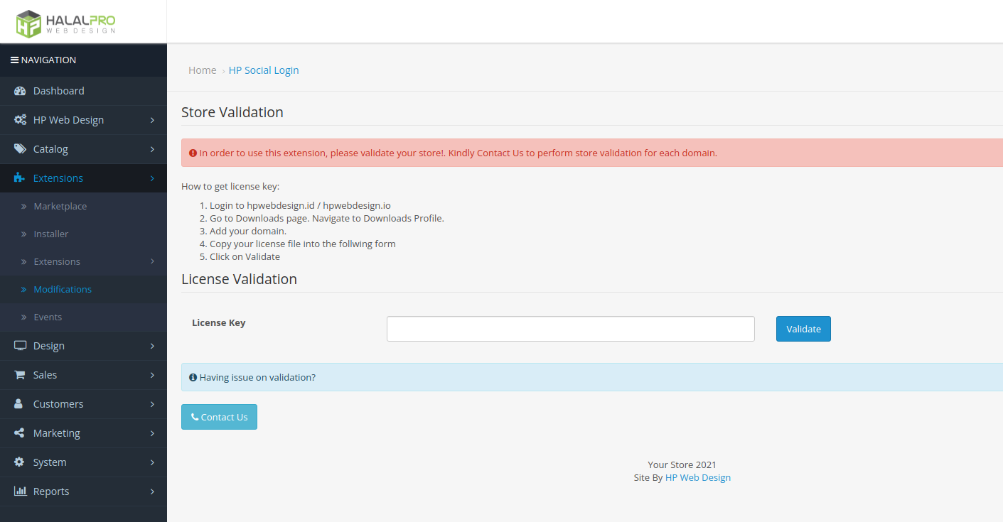 - When you navigate to HP Web Design → HP Admin Security, the following page will appear. This is because every purchase of the opencart premium extension on HP Web Design will be subject to license validation when you want to use it on the website, this validation is carried out in connection with the license per purchase limit. You can read articles about this validation process at https://bariklabs.com/how-to-get-license-key