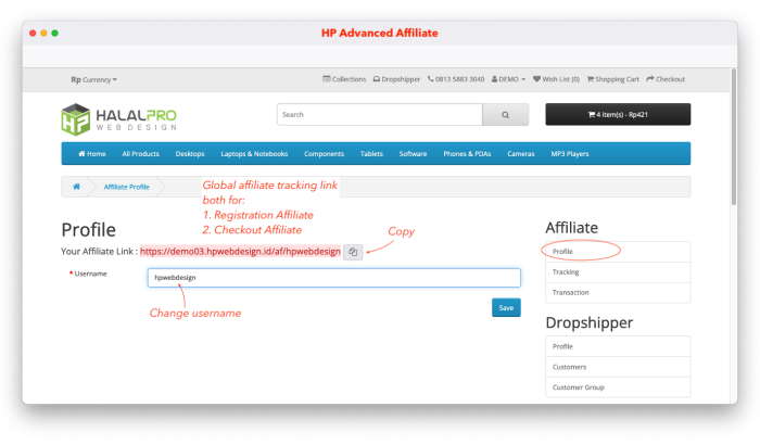 On the Profile page, you can get information of your affiliate link and you can change username as affiliate code.