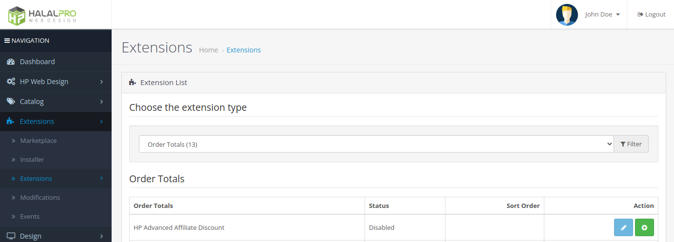 4. Go to Extensions → Extensions → Order Totals page, then install HP Advanced Affiliate and make sure it is Enabled.