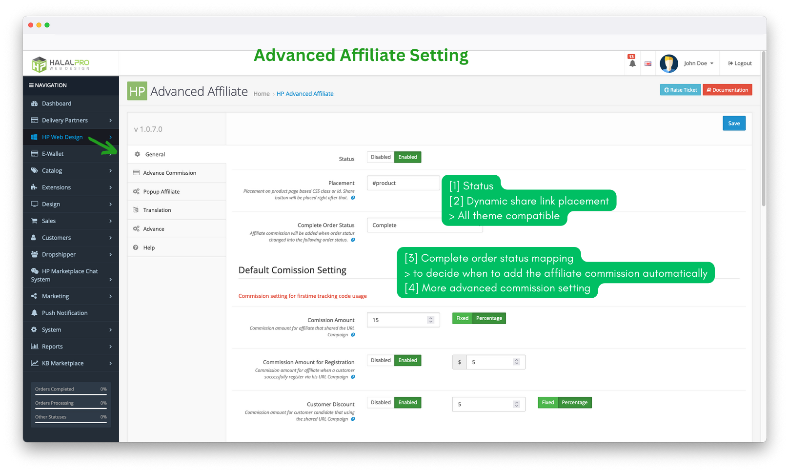 • Commission Amount : Commission for affiliates who successfully invite new customers to place an order and the order is complete according to the settings Complete Order Status.