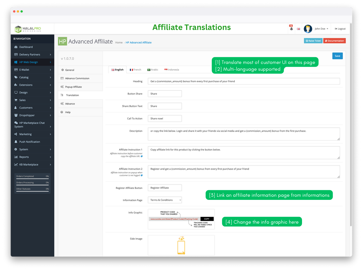 In the settings section of the translation tab, you can fill in the translation text for the various languages that are enabled, in this section there are also Info Graphic and Side Image image settings that will be displayed on the popups.