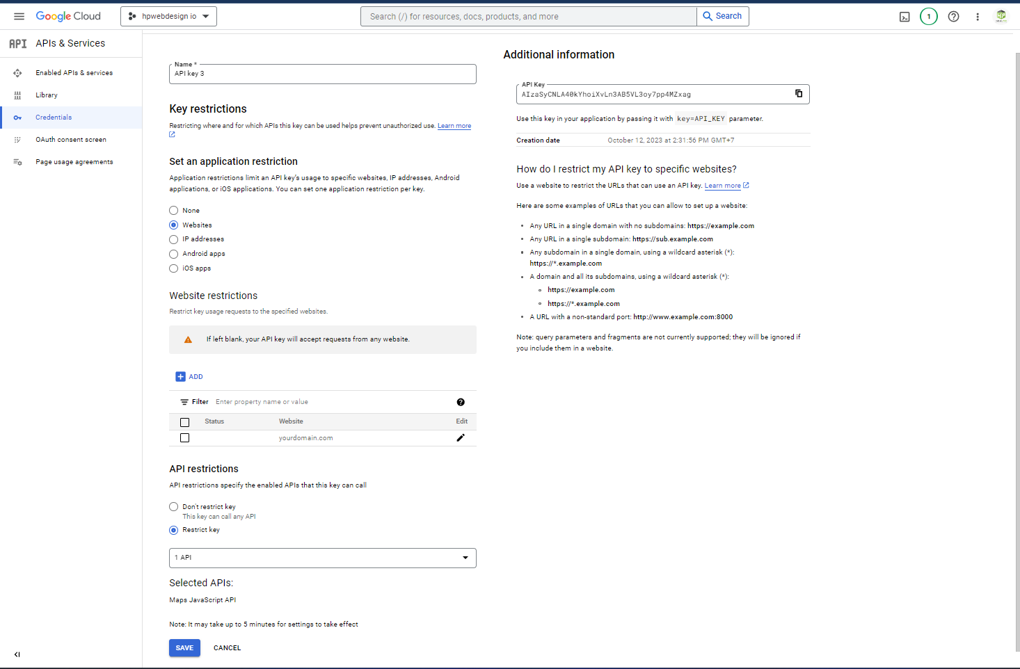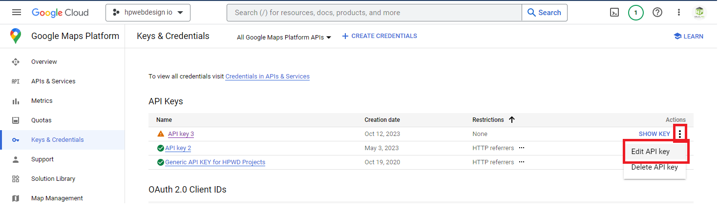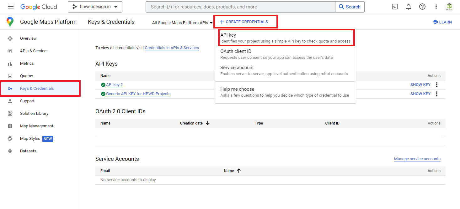 7. Goto menu Keys & Credentials and click Create Credentials and select API KEY
