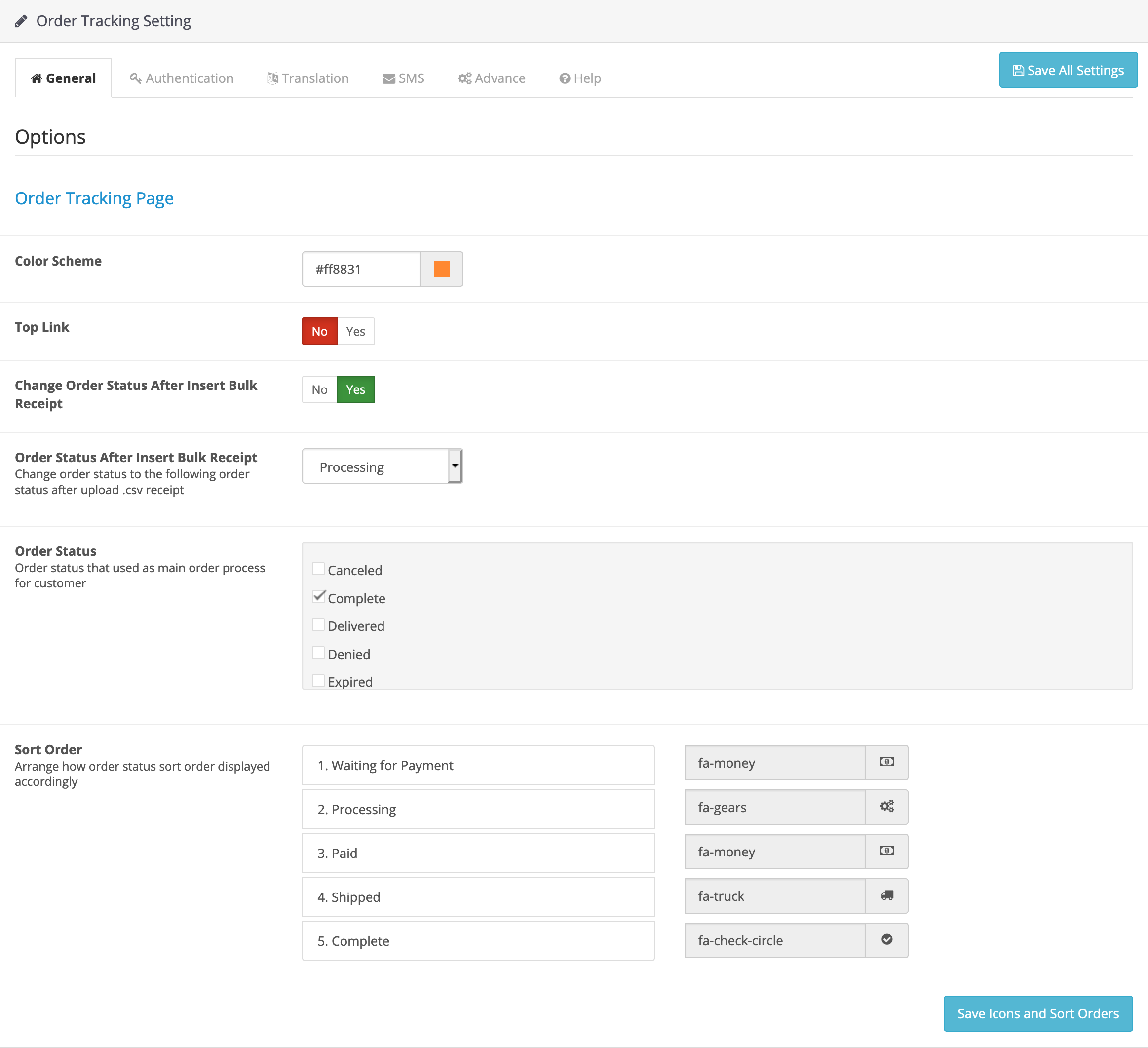 - Sort Order : As a sequence of steps in Order Tracking, you can also make changes to existing icons