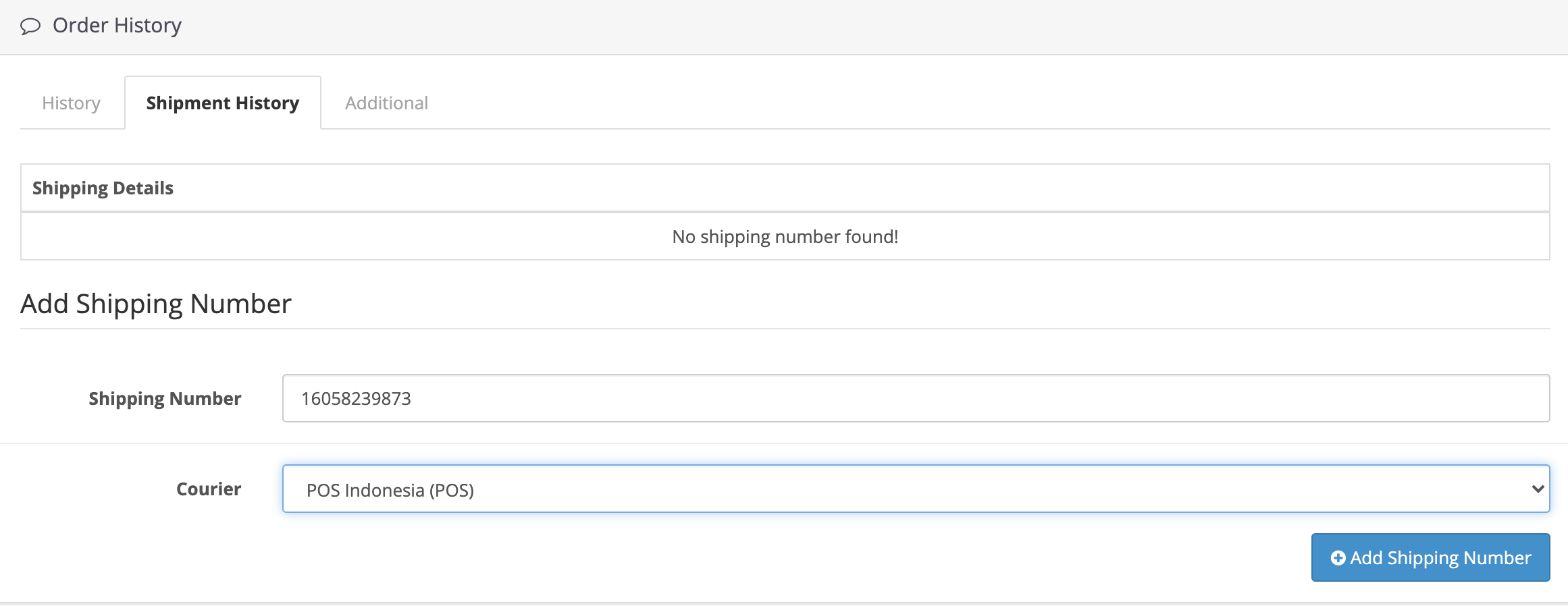 - Scroll down and select Shipment History tab, enter Shipping Number and select Courier. After that click the Add Shipping Number button.