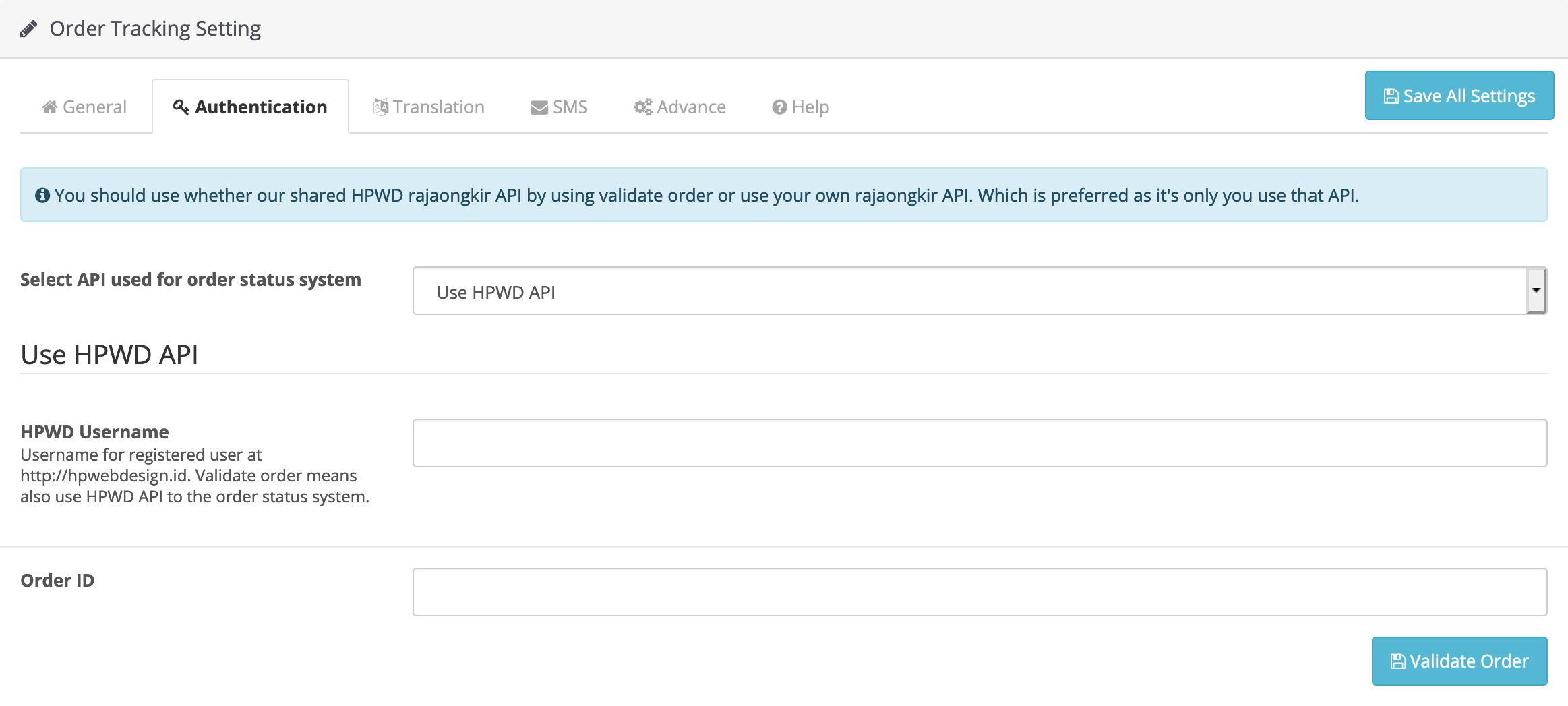 - Use HPWD API : enter username and order ID which were obtained when ordering the HP Shipping Bundle. Then click Validate. Click Save All Settings. NOTE For validation when the website is online on the hosting server there is a possibility of server incompatibility which causes validation to fail. Even though the username and Order ID are correct. Please contact Email/WA support for manual validation by us.