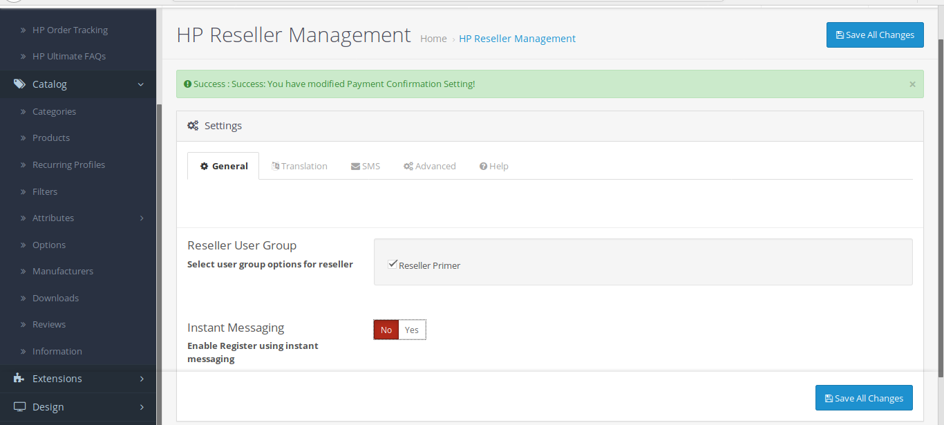 2. Next navigate to HP Web DesignHP Reseller Management to manage your store. On the General tab you can select the desired group reseller. There is also an Instant Messaging option to add registration options other than via the Web. The Translations tab works in the description of the Reseller page view of your store. You can also use the SMS Gateway provided in the SMS Tab to configure registration options via SMS.