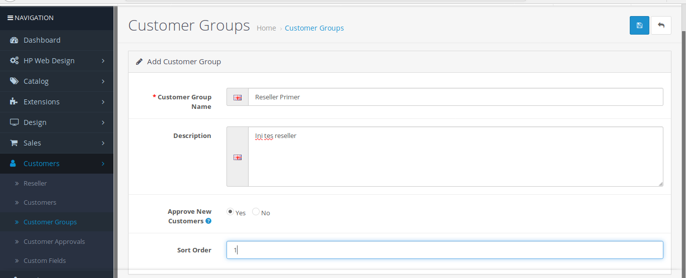 1. You can start configuring your Reseller group by creating a customer group identified as Reseller. Navigate to CustomersCustomer Groups then click Add New. Then fill in the form as you want, for example as follows.