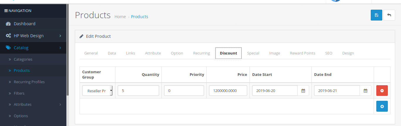 2. On the Edit page, select the Discount tab and then add a Customer Group from your Reseller group. You can write down the number of products so that you can get discounts, new prices and the validity period of the discount. Click the Save button when finished changing your product details.