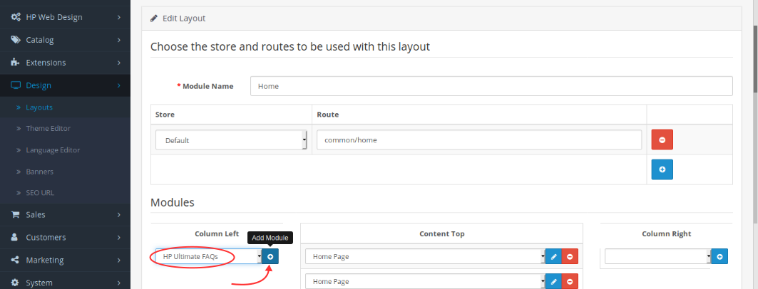 - Here I will try to add the FAQ module in the left column, please add a column as a place to put it, then click Add … to select a module.