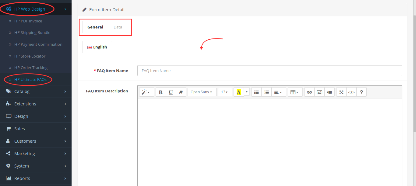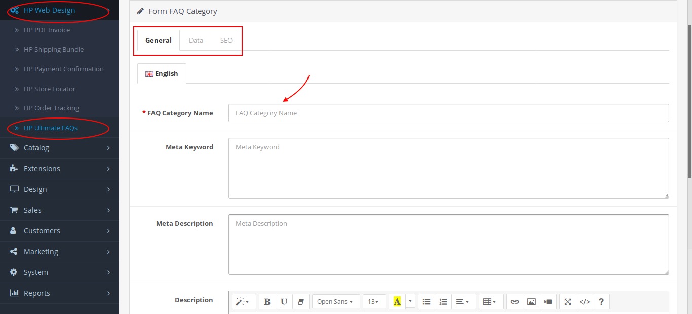 - On the General tab, you can enter category names, keywords and descriptions. On the Data tab, you can enter the order of the FAQ on your shop page. When done, don't forget to click the Save button.