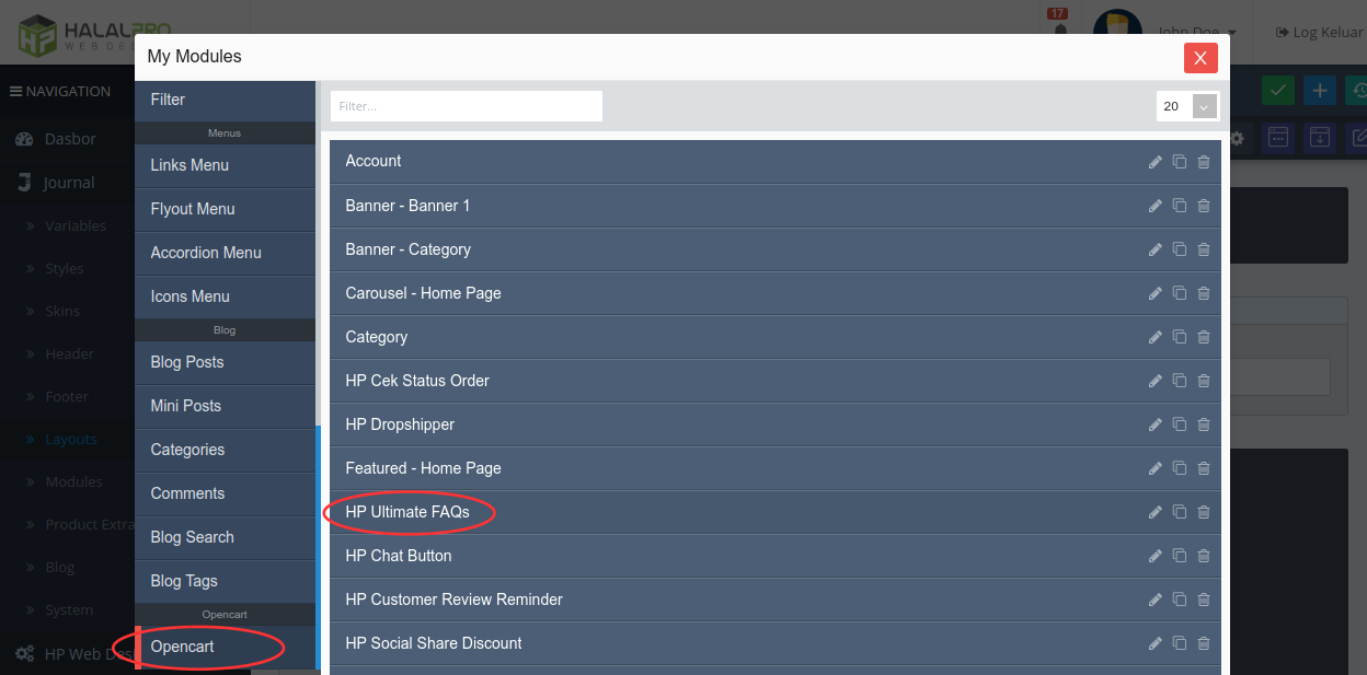 - After opening the dialog as shown below, please look for the opencart menu (usually at the bottom), then select the HP Ultimate FAQs module.