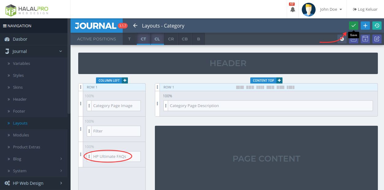 - The Ultimate FAQs module has been successfully added, don't forget to save it first by clicking the green button on the top right before leaving the page.