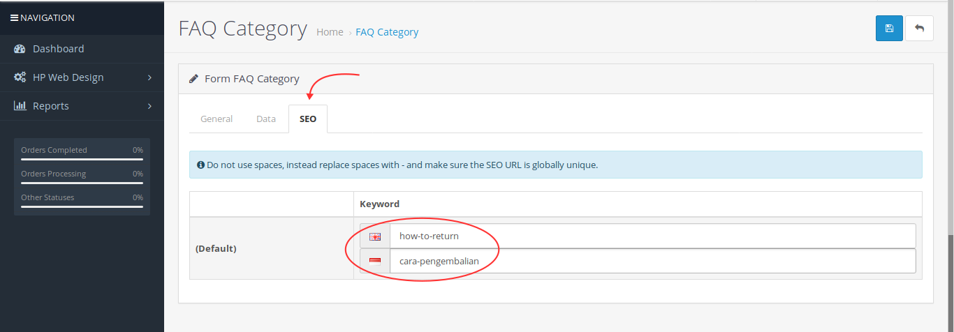- Navigate to Design → SEO URL to add the desired keywords. You can see a description of the use of SEO URLs in the following guide: https://hpwebdesign.id/cara-setting-seo-url-opencart .html