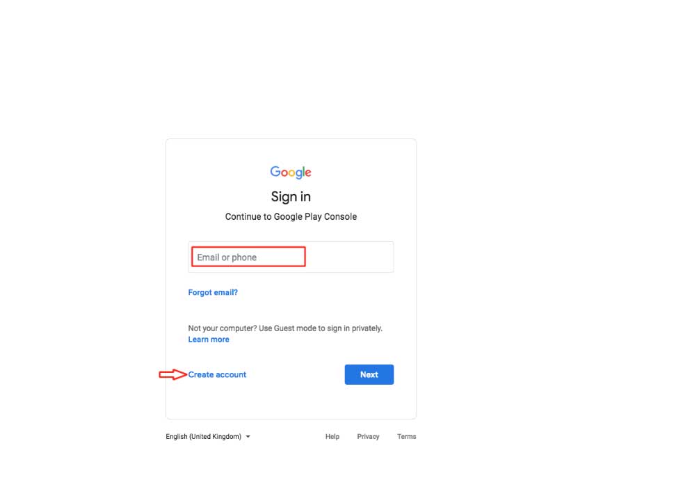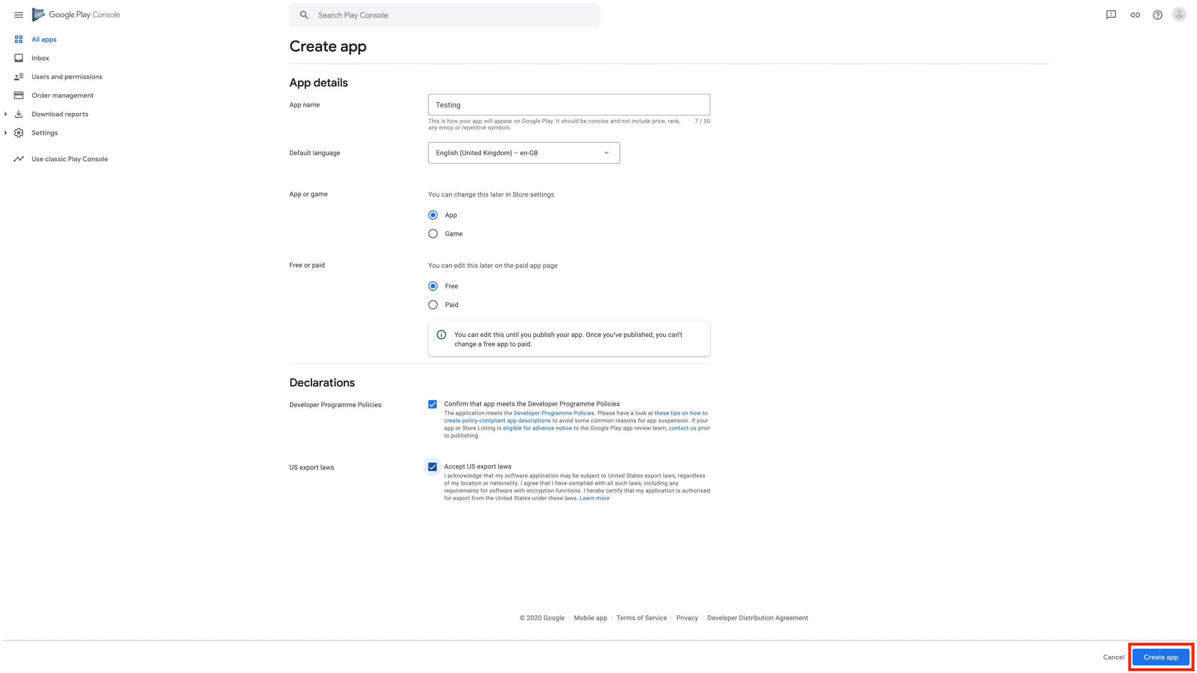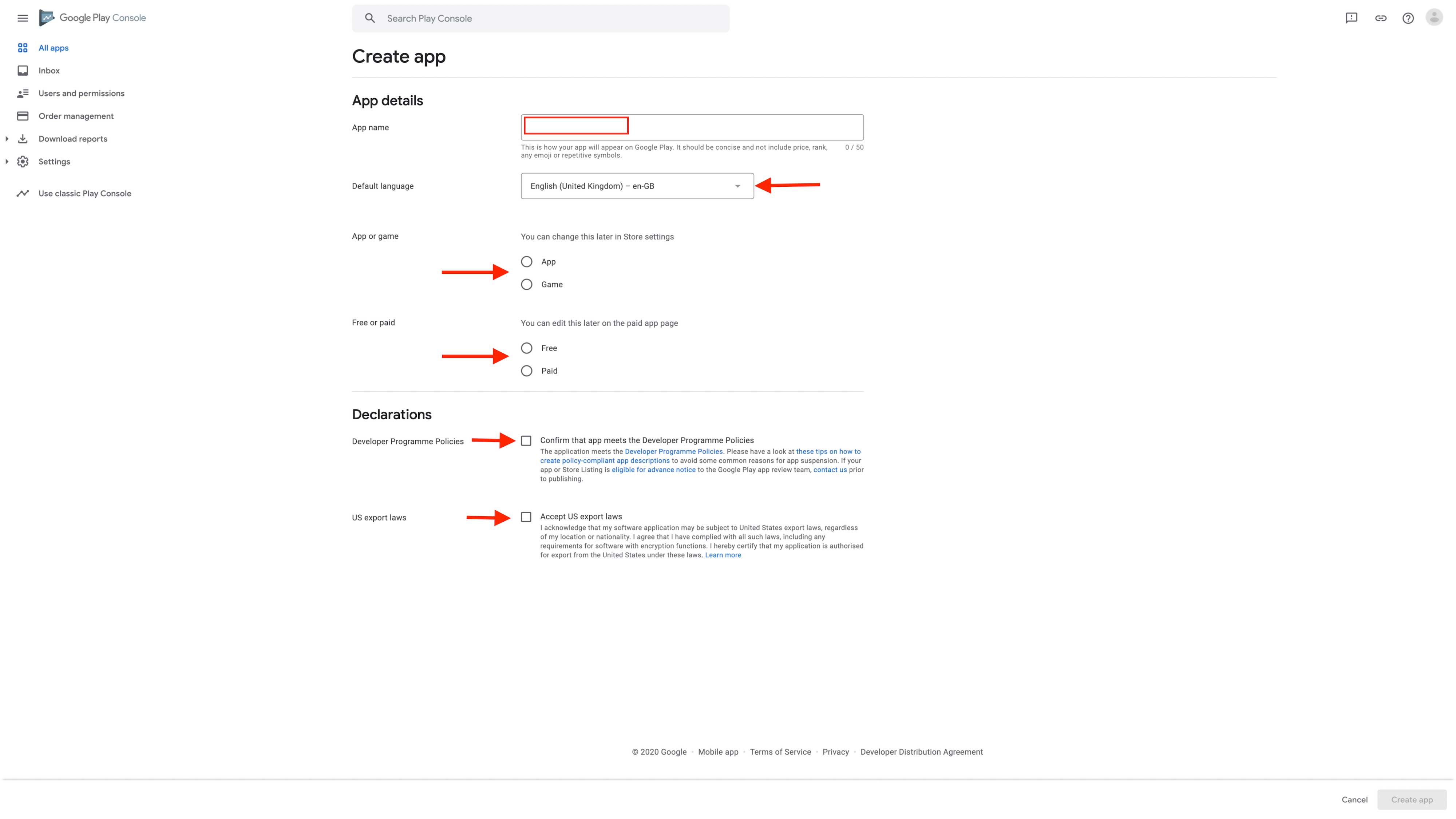 4 Enter the name of the application and select Default Language from the dropdown menu, select the type of application (Game or App) and then select the Paid or Free option to register your application as Paid or Free on Google Play. Additionally, check the Developer Program Policy and US Export Laws boxes.