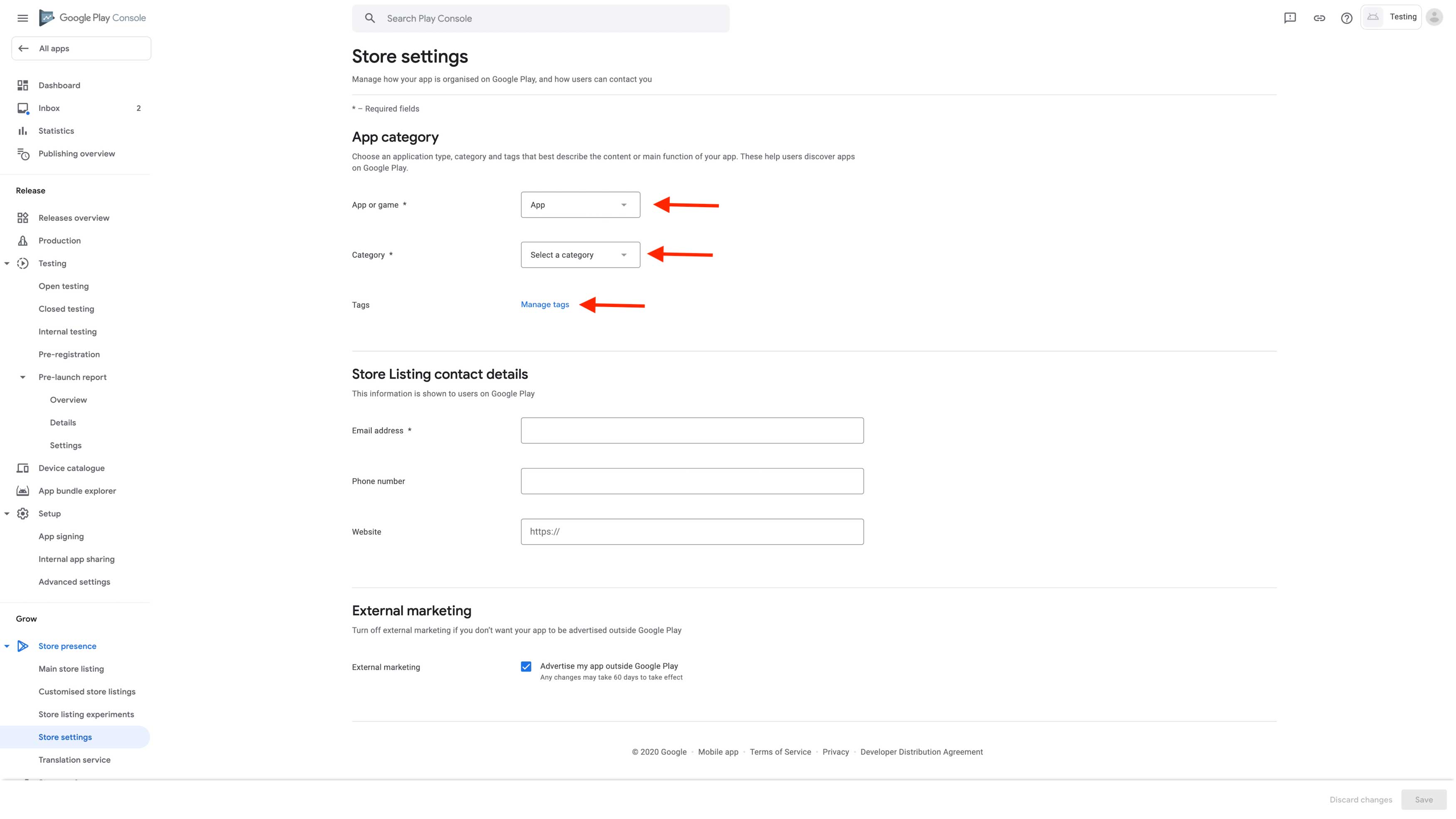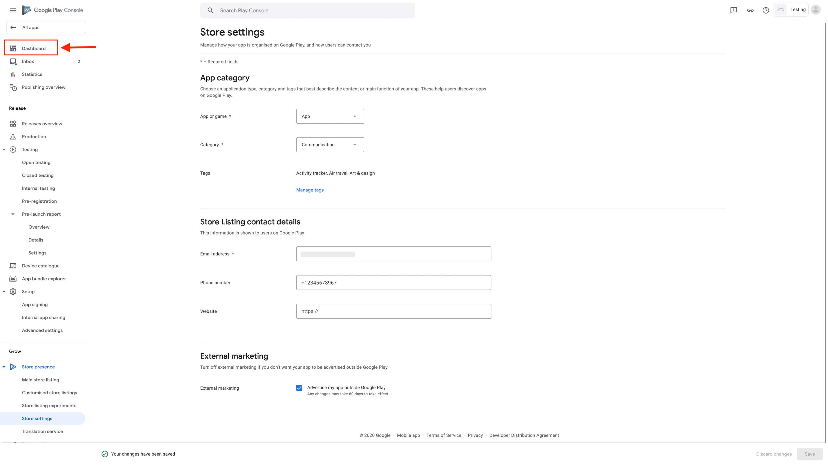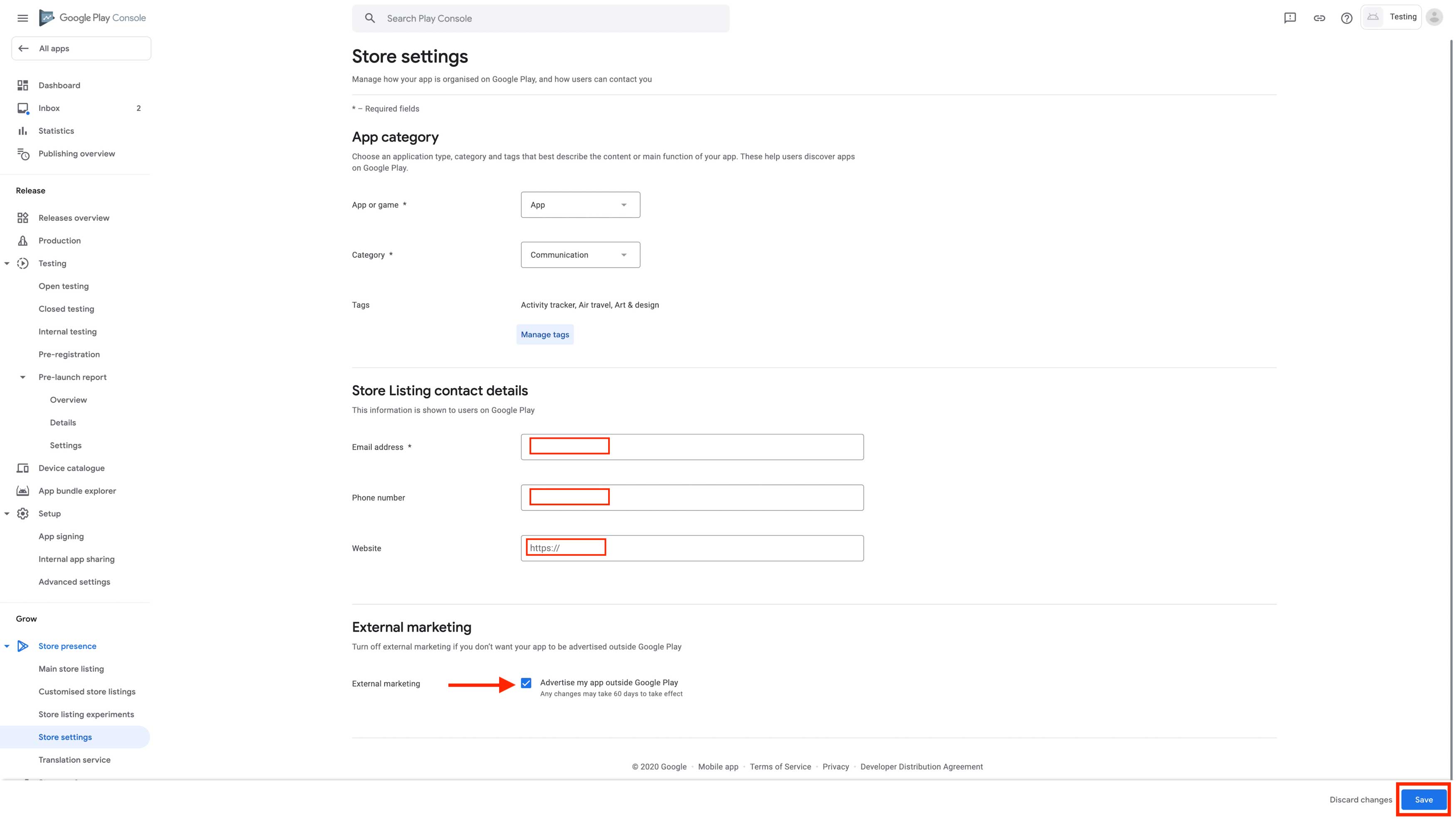 36 Enter your email address, phone number and website in the Contact Details section. Check the External Marketing box if you want to market your app outside of Google Play, otherwise uncheck this box and click Save.
