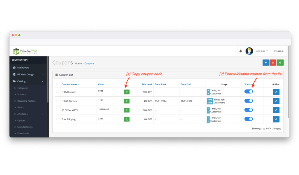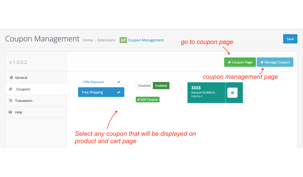 • Coupon list in coupon management taken from coupon data in Marketing > Coupons Menu, only shown for coupons whose status is activated and the date is not expired.