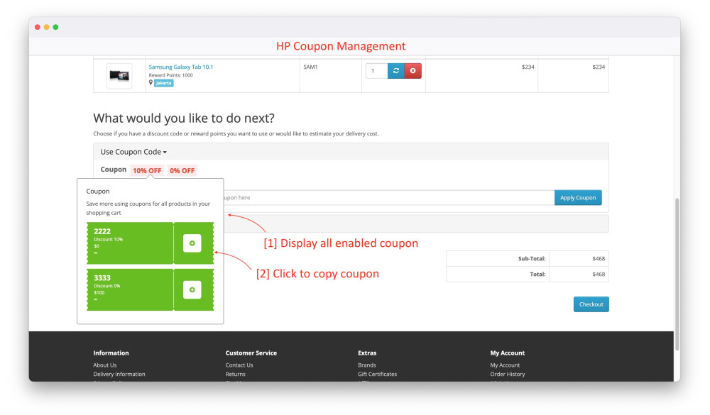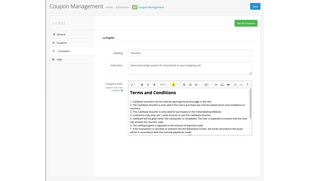 With the "Coupons" menu provided on the top menu, your customers can visit the coupon list page, here your customers can see the coupon more clearly, you can also provide information such as "Terms and Conditions" if needed