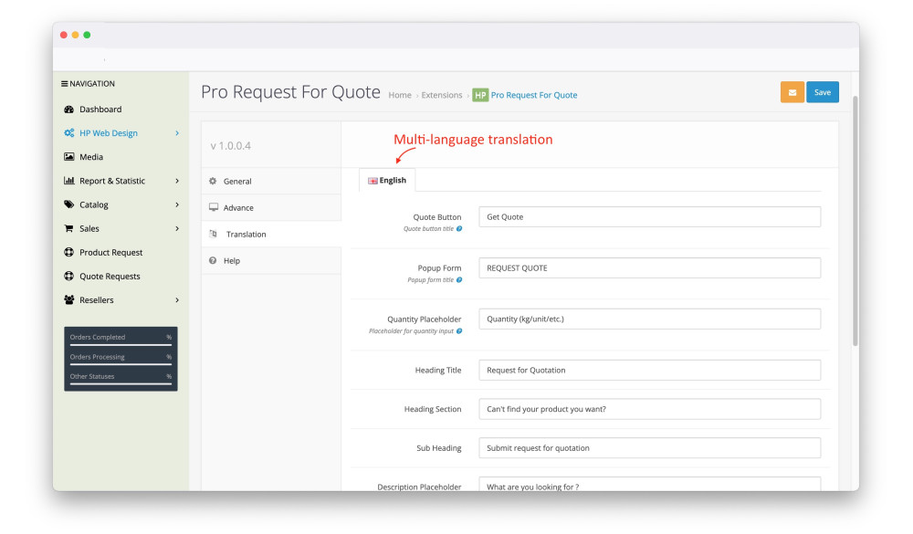 - Translate into your local language for most UI labels for quotation popup and section
