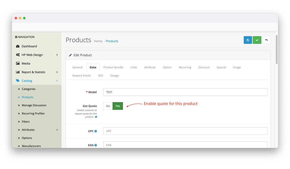 - To activate the button and offer form on a product, you need to go to the product form, the HP Pro Request for Quote module creates a new setting called "Get Quote" which you can enable and disable