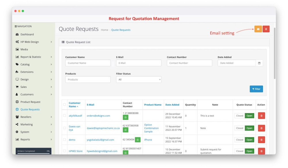 The data sent by the customer will be recorded, and can be accessed on the admin page by clicking the "Quote Requests" menu, you can use this data to follow up on customer offers such as contacting them via whatsapp.