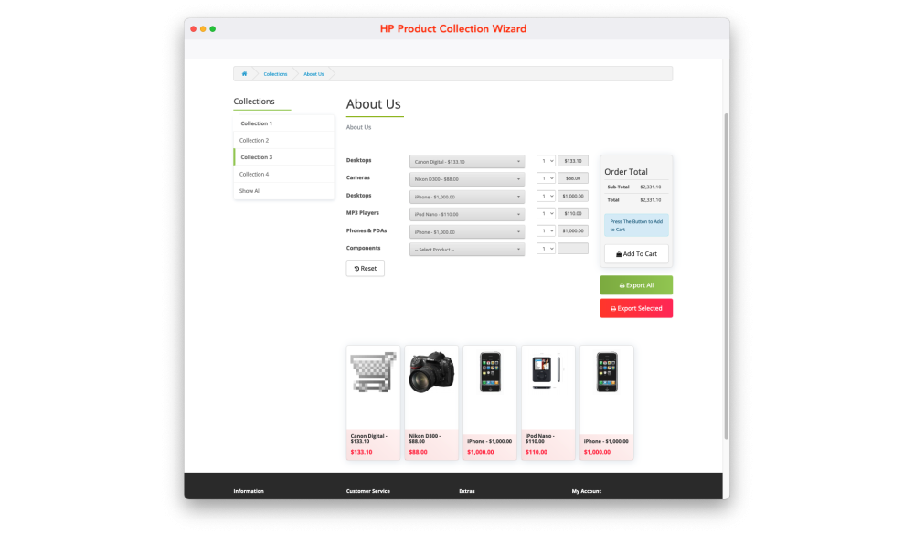 • The collection information page contains features added to cart along with price information and customers can export product collections to various file formats