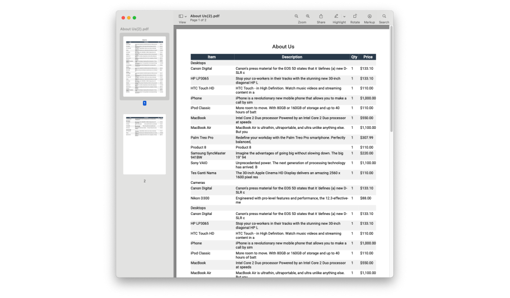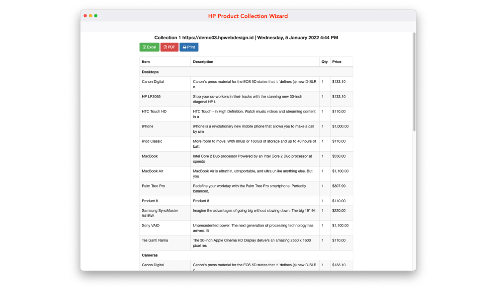 • Below is an example of a product collection export page, you can export it to an excel file, pdf, or print it in a browser