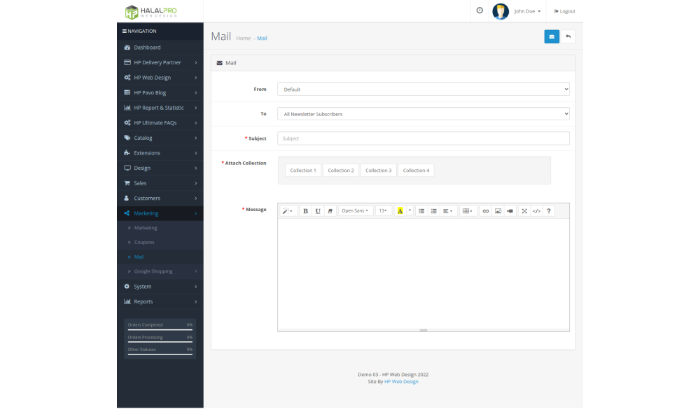 • You can choose one of the collections to be sent to the marketing email which can be accessed on the Marketing menu > Mail