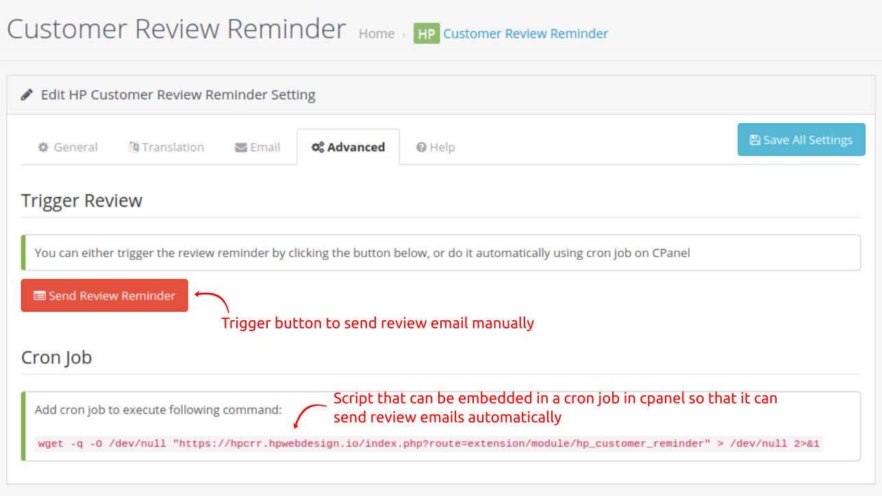 Next is the advanced tab, here will be given additional information and actions so that this module can send email, either manually or automatically. The manual way is to click the "send review reminder" button and the automatic way to paste the script that has been provided to the cron job on your cpanel hosting page. By doing one of the methods above, this module will send an email to the customer if the requirements are met (such as the customer has not done a review, etc.).