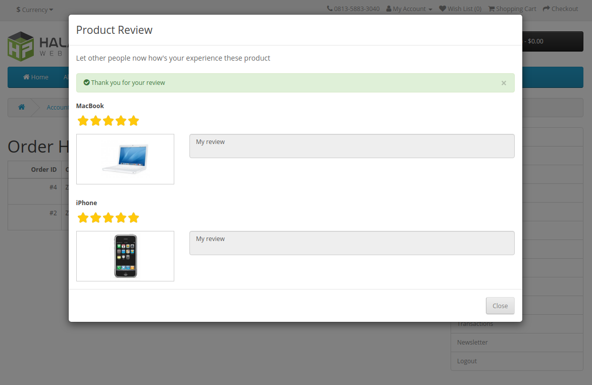When the review button is clicked, a dialog will appear that displays a review form for each product ordered. Customers are welcome to fill out and submit reviews for the products they have purchased.