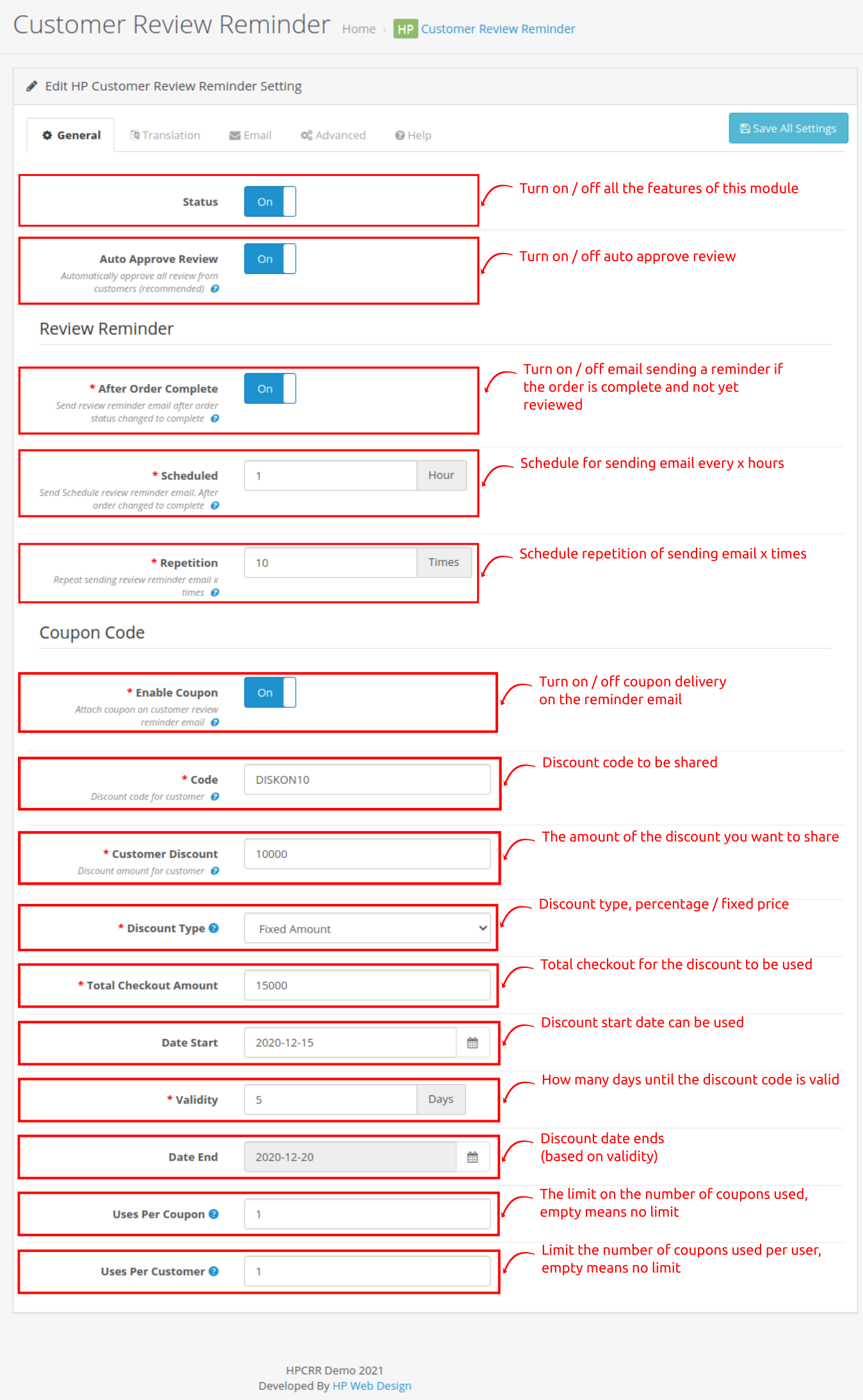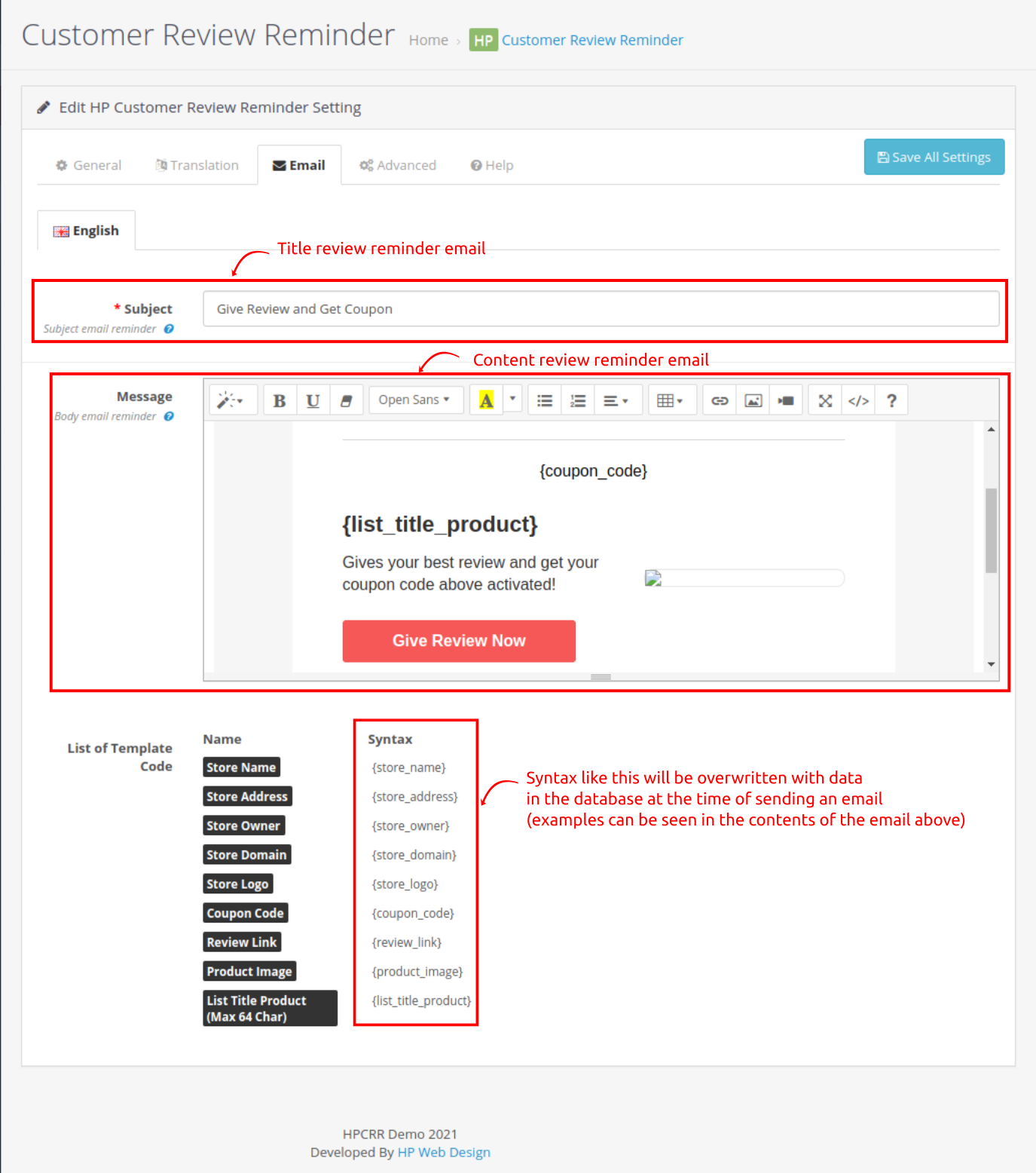 Almost the same as the translation tab, in this email tab you can set sentences and language for review reminder emails that will be sent to customers. You can read further explanation in the image below.