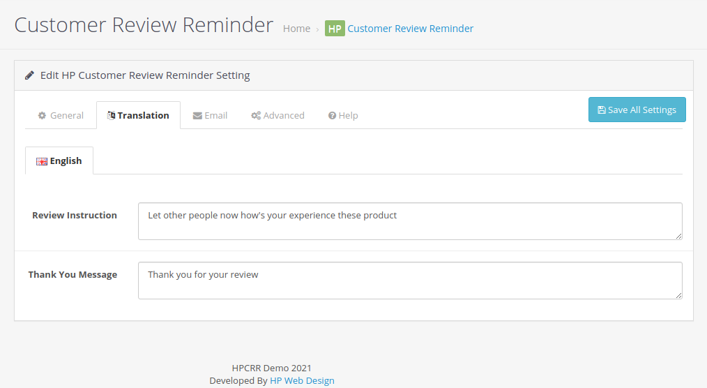 The translation tab in this module functions to set the sentences and language that will be displayed on the front page, for now we only provide review instruction field, and thank you message field, you can see the two texts in the review dialog that we discussed earlier.