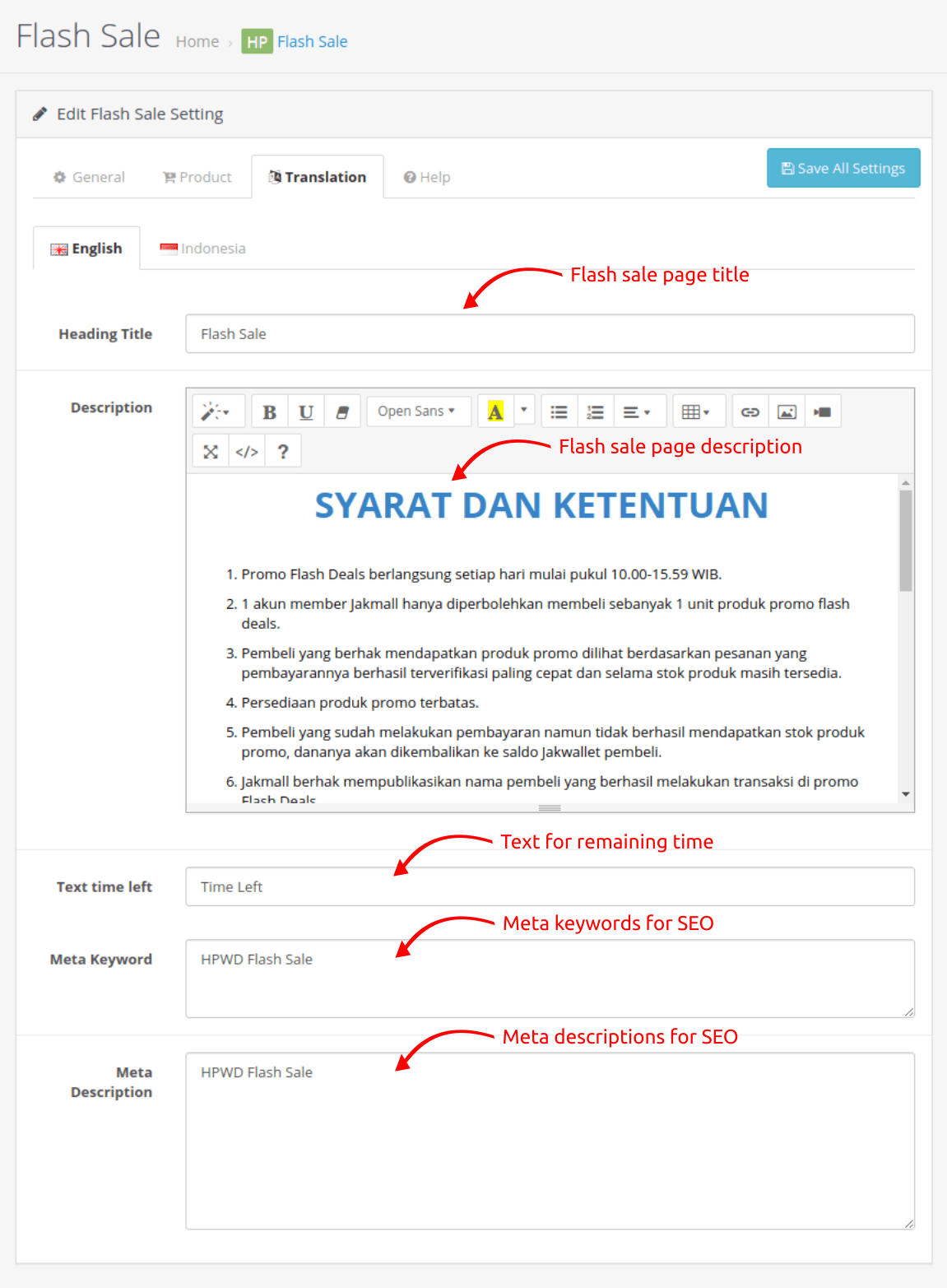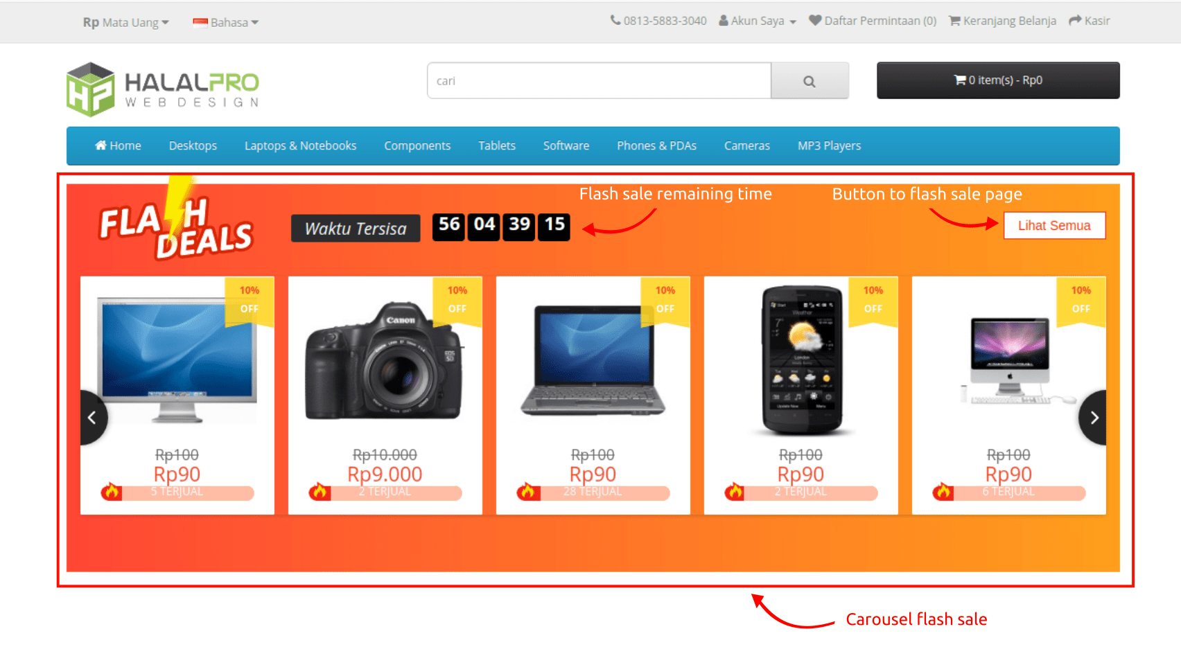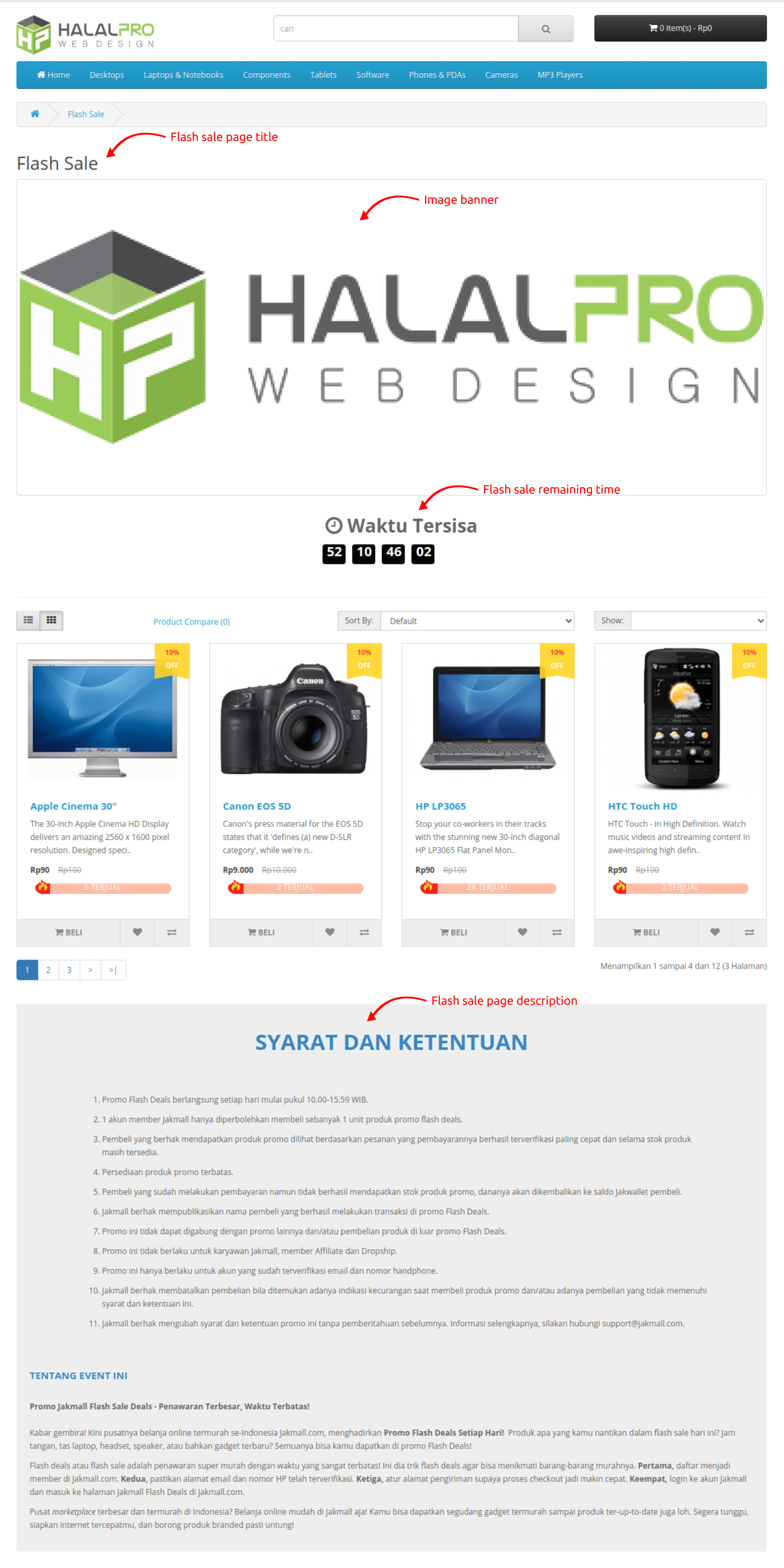 If we click the "see all" button, it will immediately be directed to the flash sale page as shown in the image below. In the preview of the front page, you can see which text can be set on the admin page as I explained on the translation tab earlier
