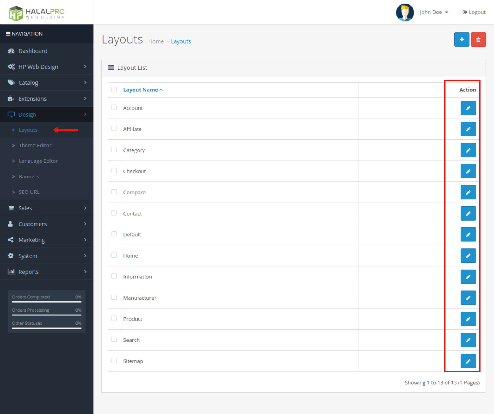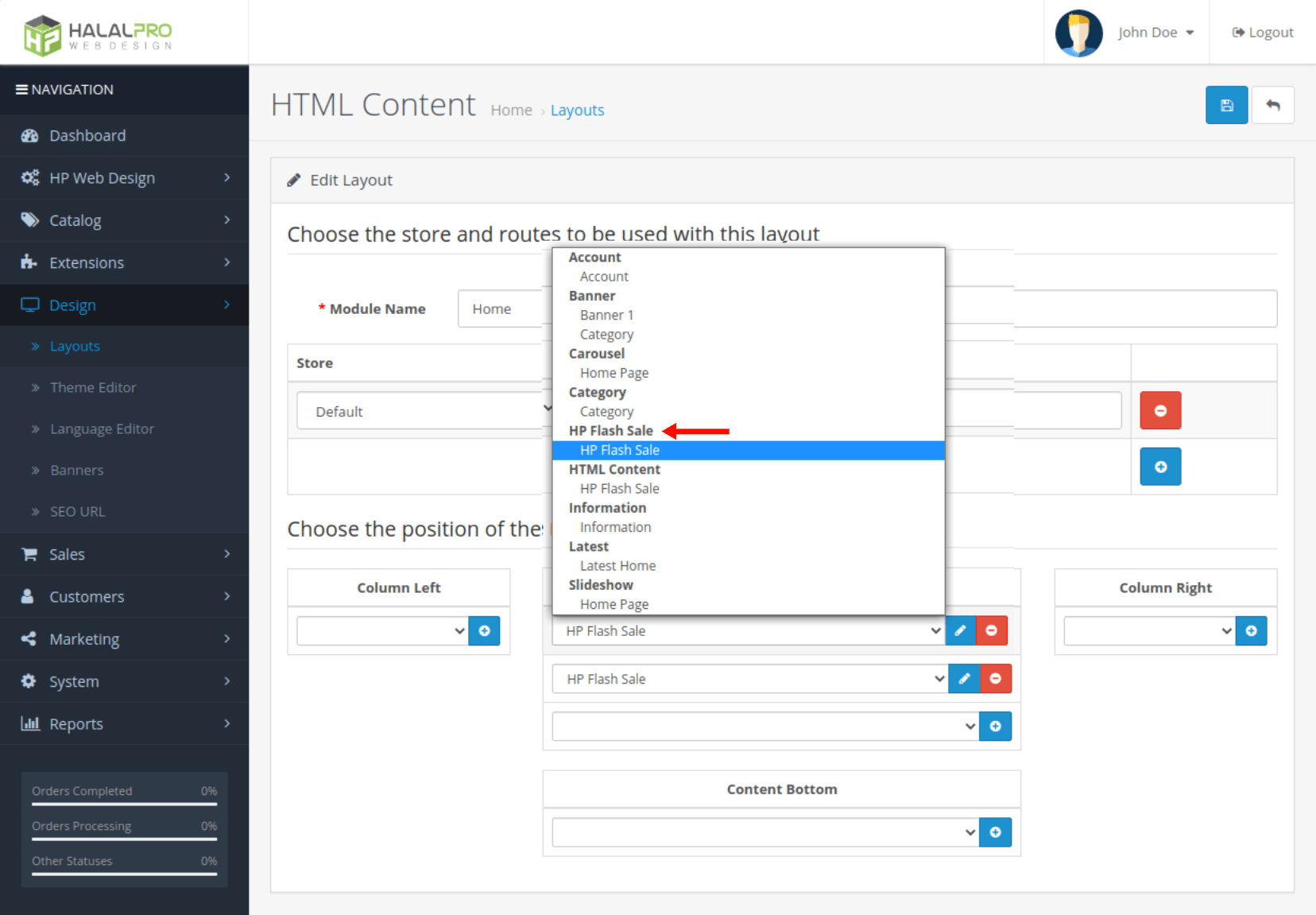After making all the necessary settings and adding a flash sale product, don't leave the admin page, because we have to determine where the flash sale module is located on which page. Please go to menu design -> layout and press the edit button on the page.