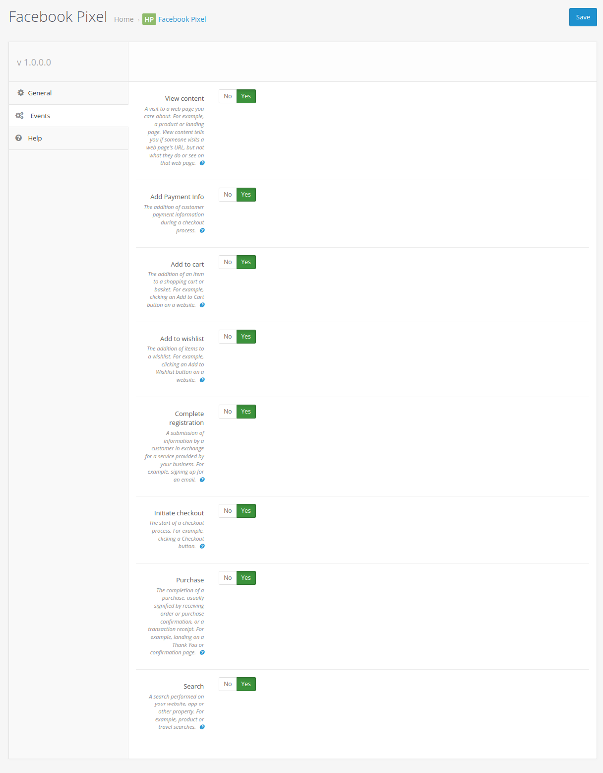 - Allowing you to enable only the tracking events you need, tracking events are available based on the Meta pixel standard events documentation at https://www.facebook.com/business/help/402791146561655?id=120537668283214