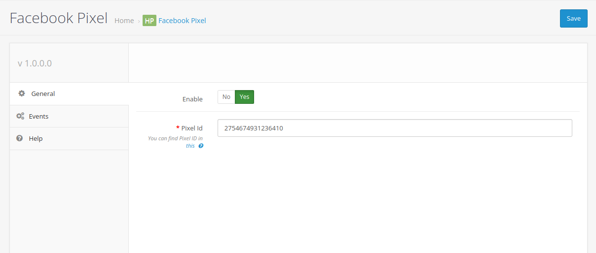 - After installing the module, you only need to fill in the available pixel ID and enabled the module and events