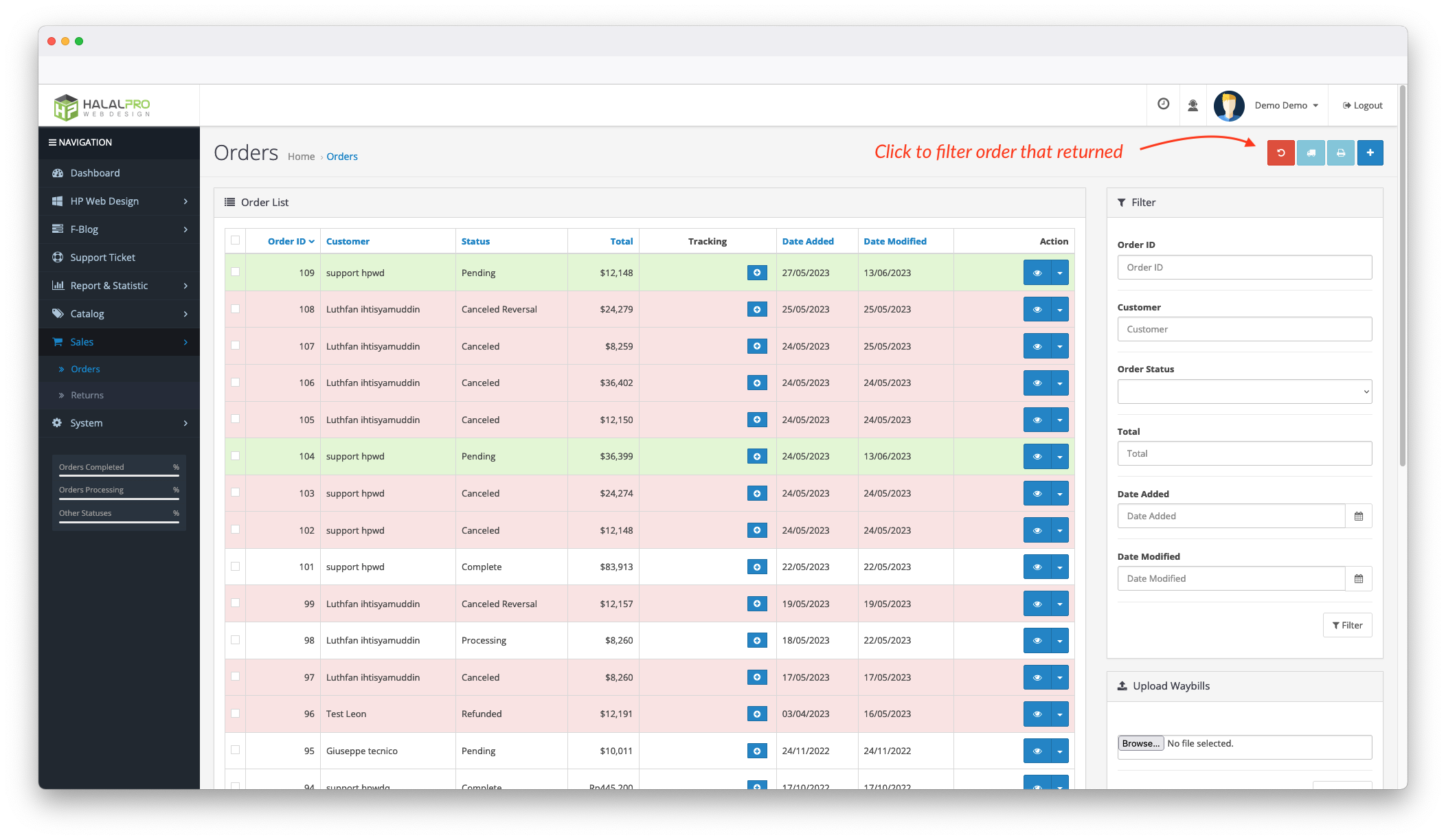 2. Highlight Returned Order on the Order Page