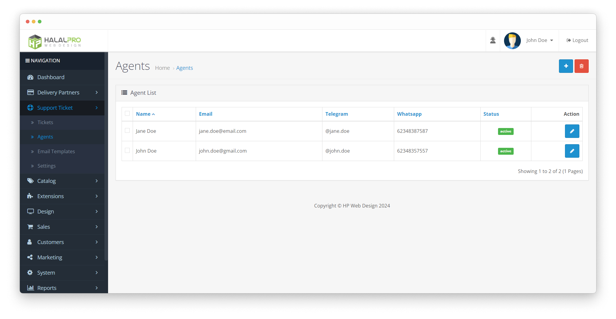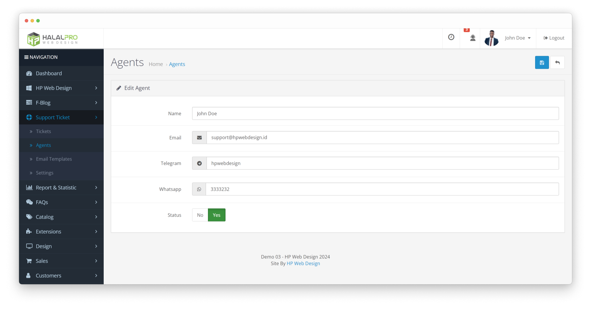 - Edit Agent Profile : Enables admin to easily manage support agent's profile data along with their active status. Agent with active status will be automatically assigned to incoming support ticket.