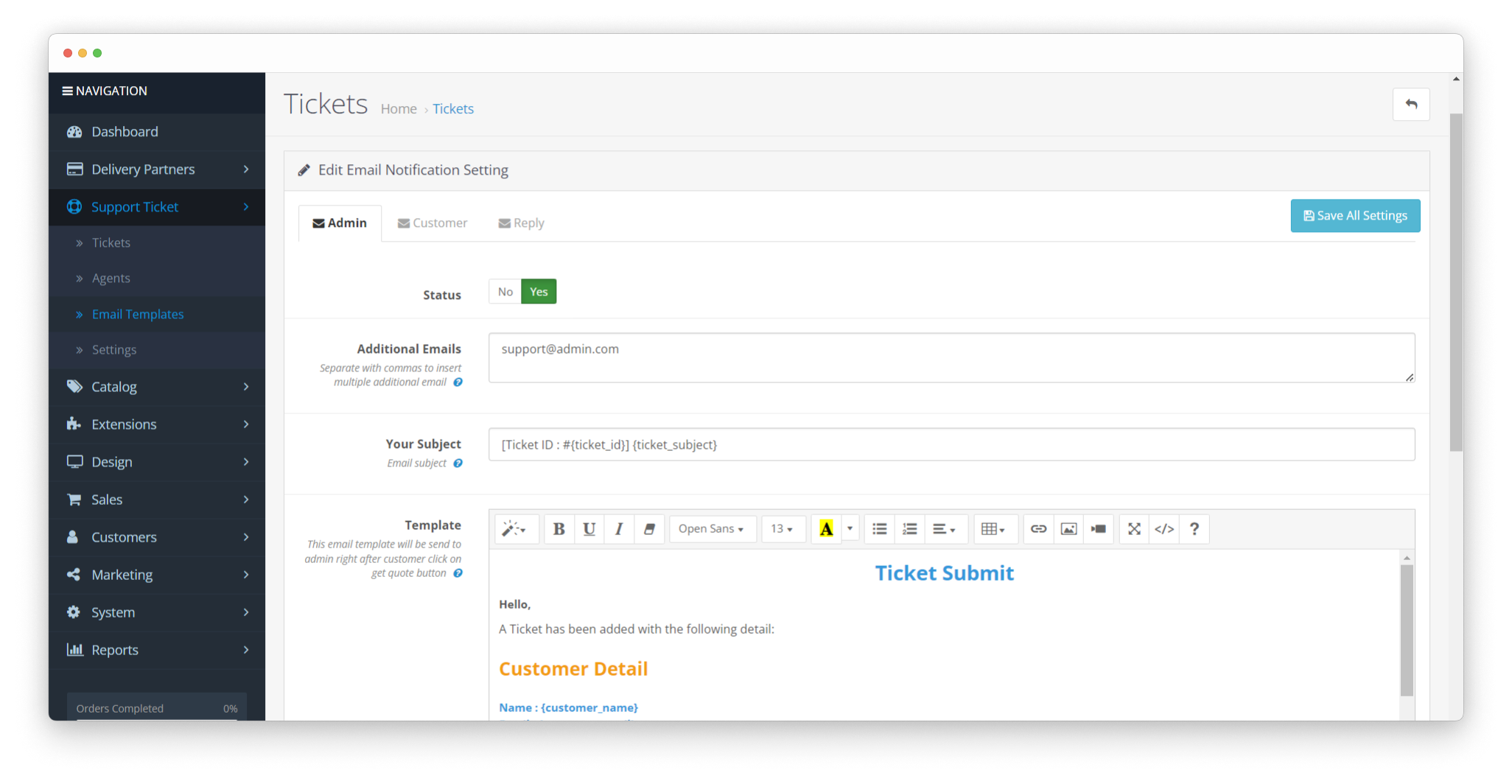- Notification Management : Allows admin to manage the details of email notification that will be automatically sent to agent and customer