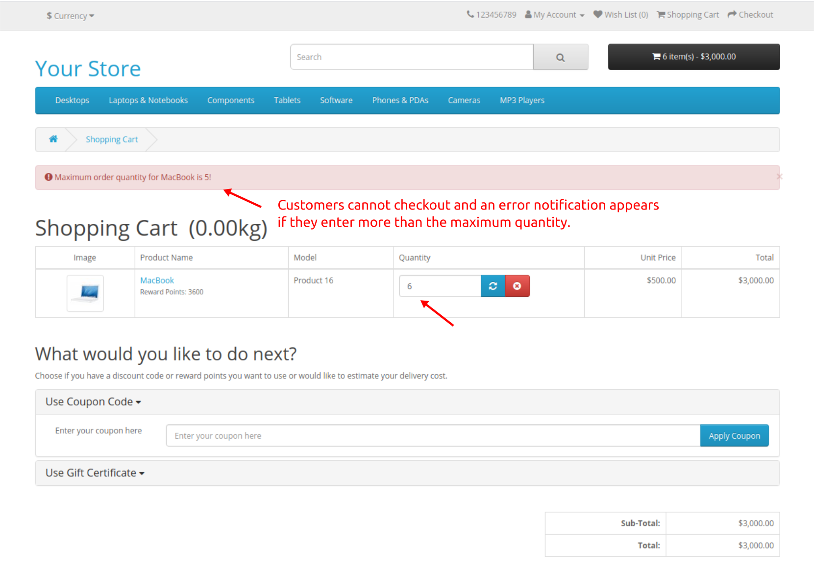 On the checkout page, if a customer fills in the quantity of a product more than the maximum quantity specified above, an error will appear and the customer cannot checkout