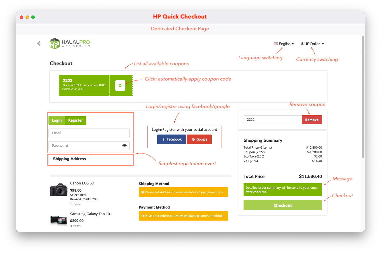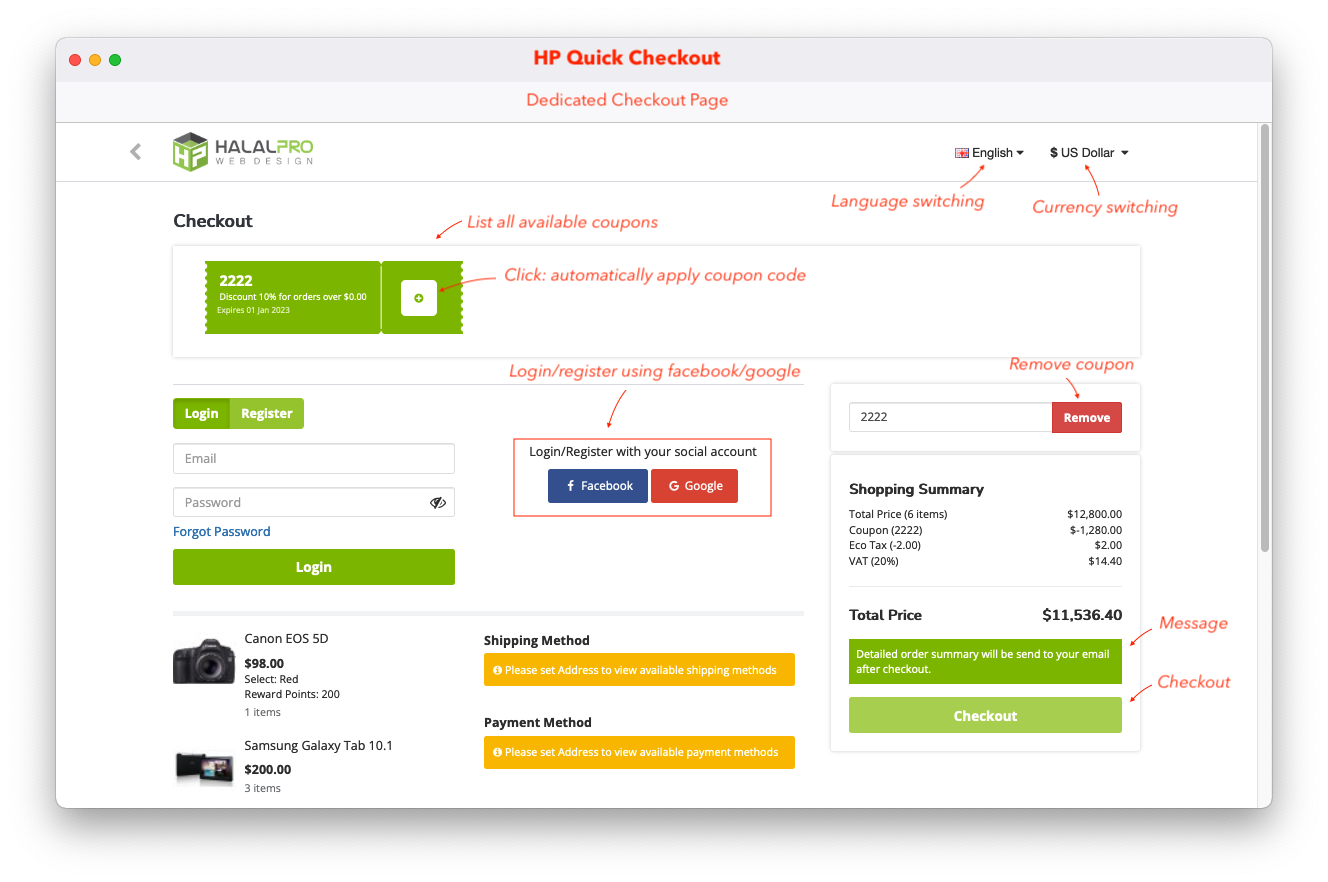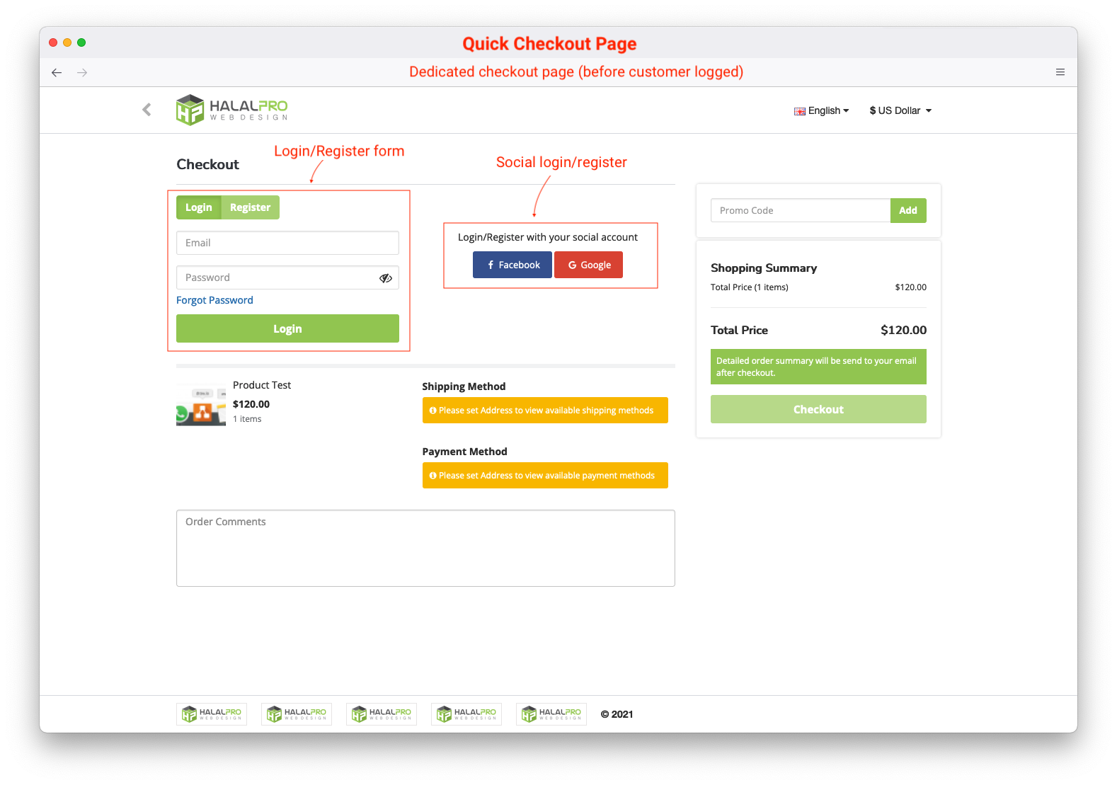 • Allow customers to log in and register using Google and Facebook so it can speed up the checkout process