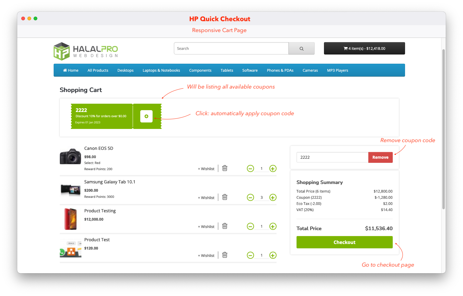 • Cart and checkout pages can display a list of coupon codes that customers can use immediately