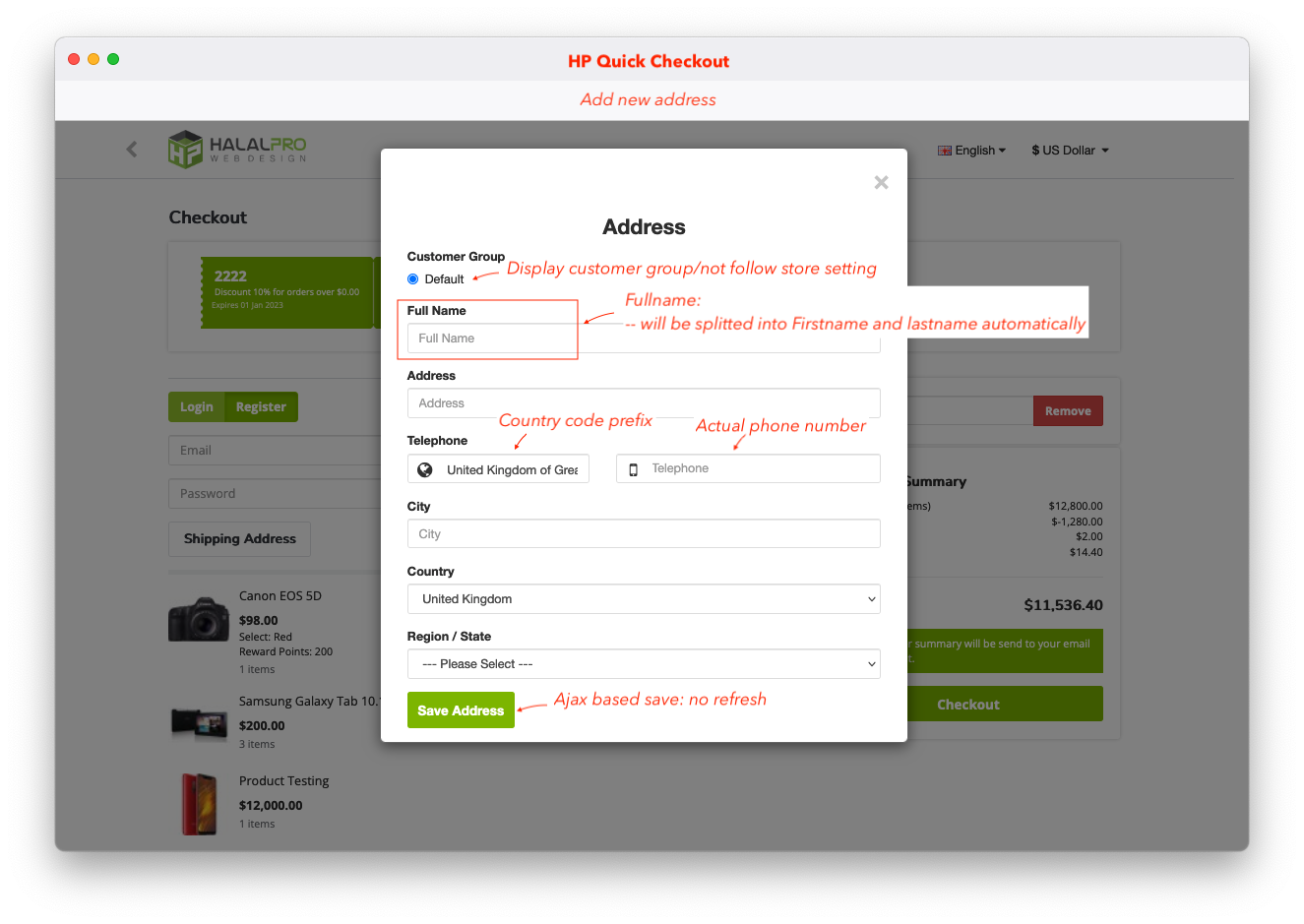 • No need to open another page, your customer can directly add/edit address on checkout page