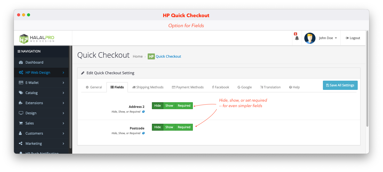• Address 2 and Postcode are address fields that can be Hide, Show(filled optional), or required(must be filled).