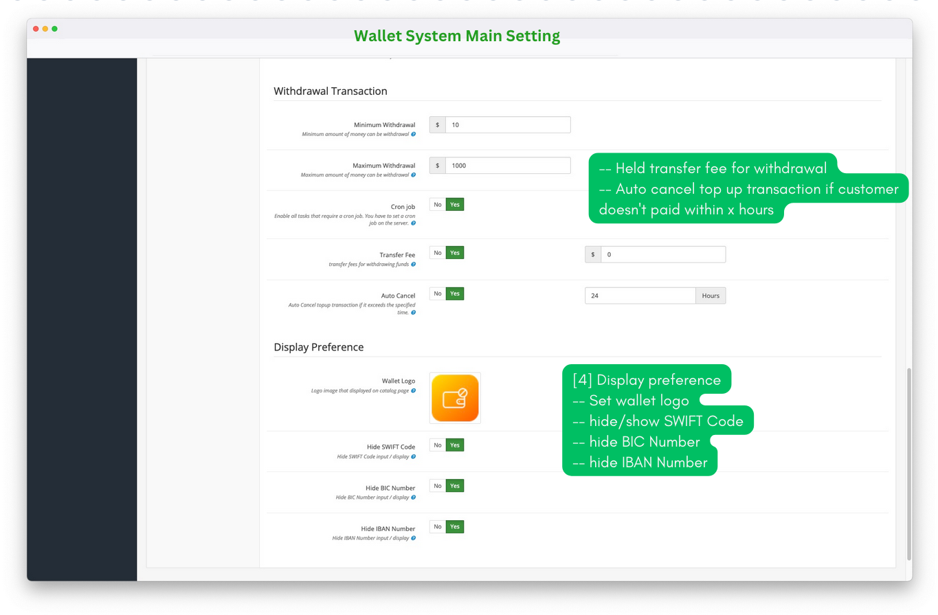- Add bank transfer information where customer will transfer to money to: when adding balance to wallet.