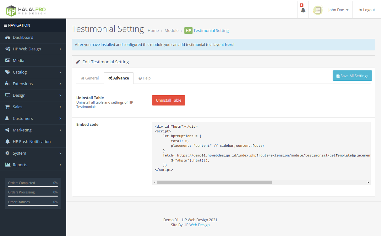 - The HP Testimonials module is very easy to add to the front page by setting it in the design > layout menu (see more in the documentation)
