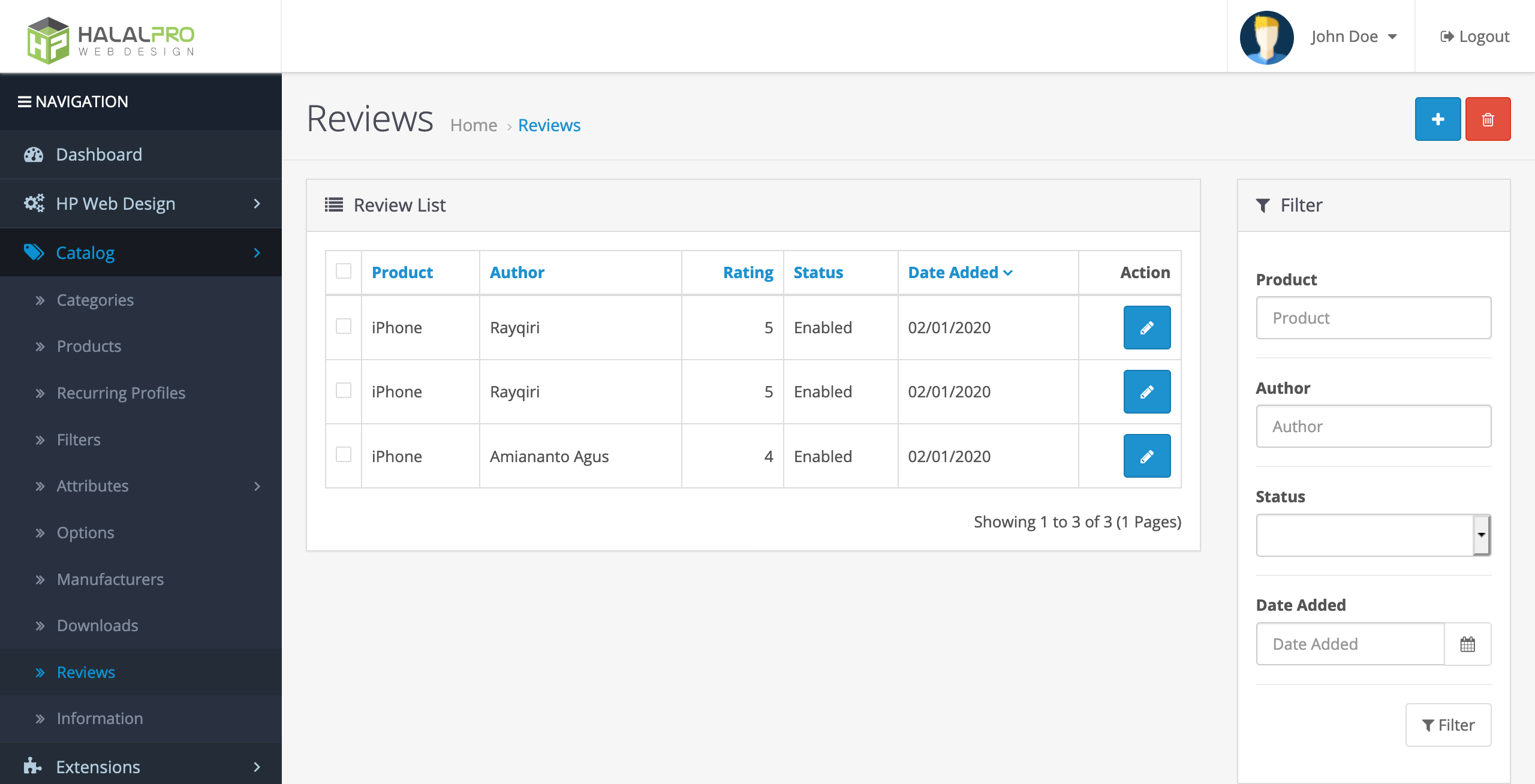 - You can see all incoming reviews on the Admin → Catalog → Reviews page and can add reviews manually by clicking the Add button.